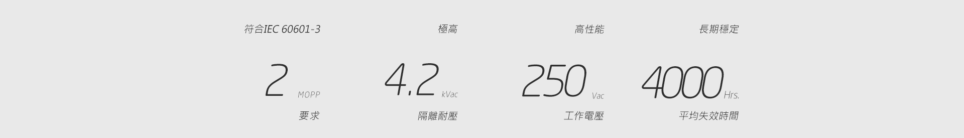 要達到醫療用電源轉換器的規格必須要非常地小心,特別是針對醫療設備的重點安規以及環境標準。所有的醫療用電源轉換器皆須符合EN/UL 60601-1的安規標準,達到病患雙重隔離保護(2MOPP),並且要符合EN/UL 60601-1的高隔離耐壓標準,高隔離耐壓也可以阻止電路元件本身工作電流導通到其它元件,高隔離耐壓更有可以減少病患漏電流的好處。頻譜的所有醫療用電源轉換器考量到要避免觸電問題,皆採取低漏電流設計。