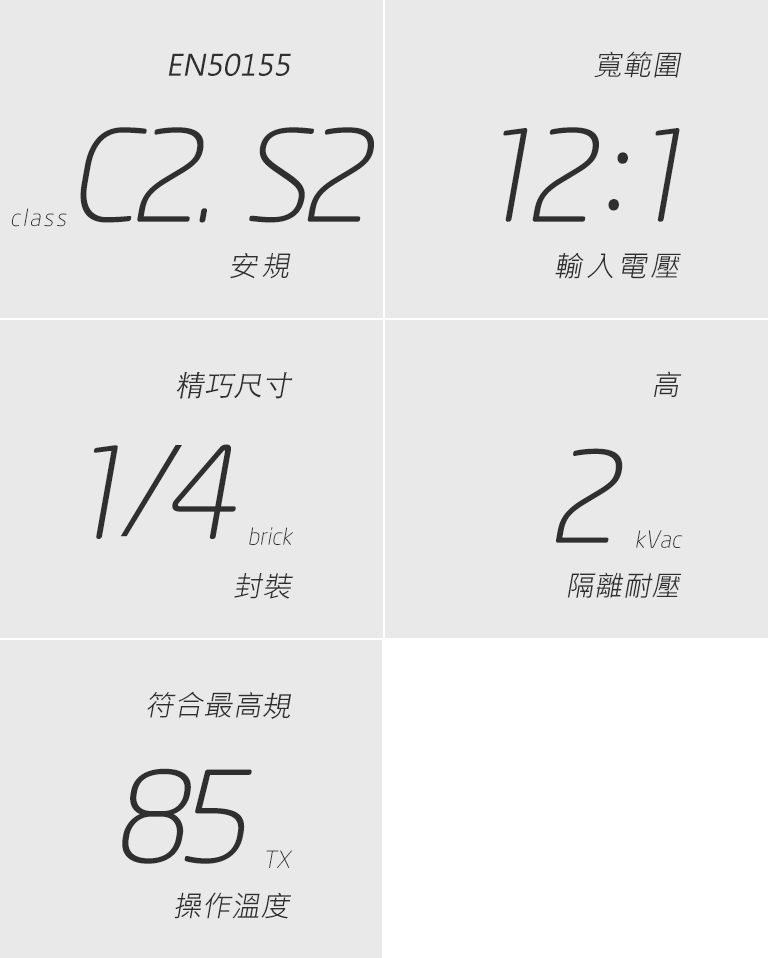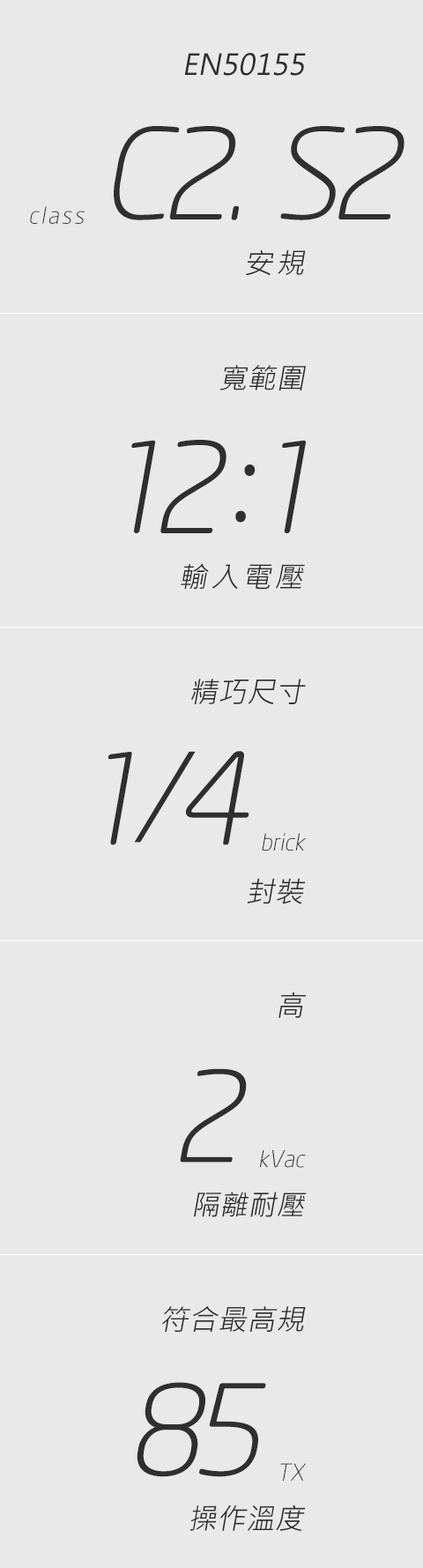 頻譜的鐵道應用電源模組設計,符合特別針對鐵道應用規範的EN/UL50155的標準,我們的電源模組基於工業等級產品的基準,滿足電子、機構以及鐵道應用的環境要求等等。我們更於2016年取得IRIS認證(國際鐵道行業標準),在設計與生產電源系統上面獲得國際標準的認證,我們獲得認證的工廠所生產的DC-DC及AC-DC電源模組皆能符合國際鐵道行業標準的要求,這也證明了頻譜有能力可以生產達到世界級要求的產品。