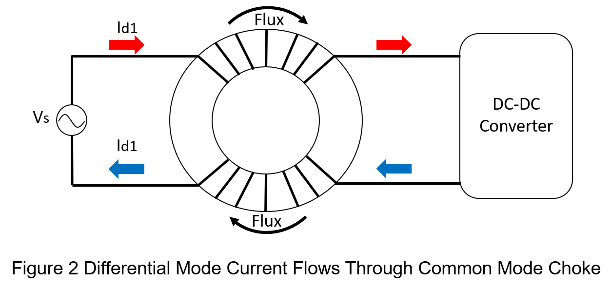 Ideally, the magnetic flux density of a common-mode choke does not increase under differential-mode current. This means that even when a large differential-mode current flows through the choke, it will not drive the core into magnetic saturation.