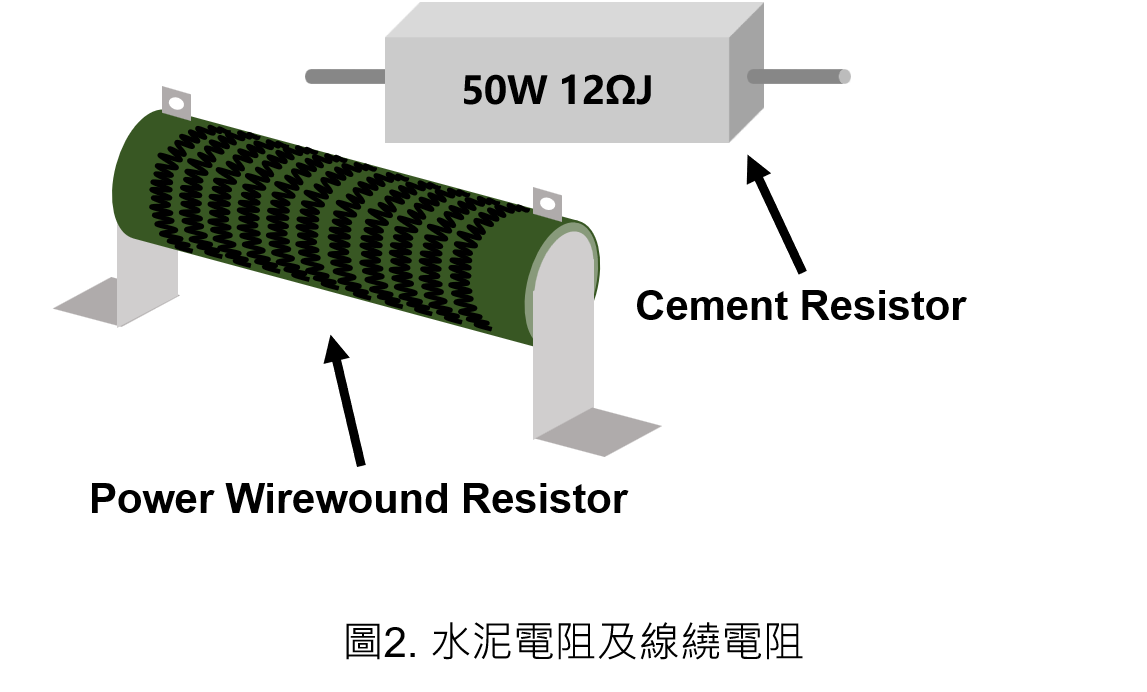 用於電源轉換器的負載測試所使用的電阻通常為高功率電阻,例如水泥電阻及線繞電阻,如圖2。