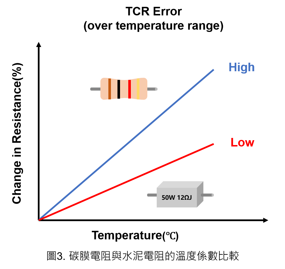 由於大功率的應用上較多發熱問題,隨溫度上升電阻值漂移,影響測量準確度,所以電阻溫度係數的穩定度很重要,圖3說明水泥電阻相較碳膜電阻具有較低的電阻值變化隨著溫度增加,其中以 ppm/°C 為單位。