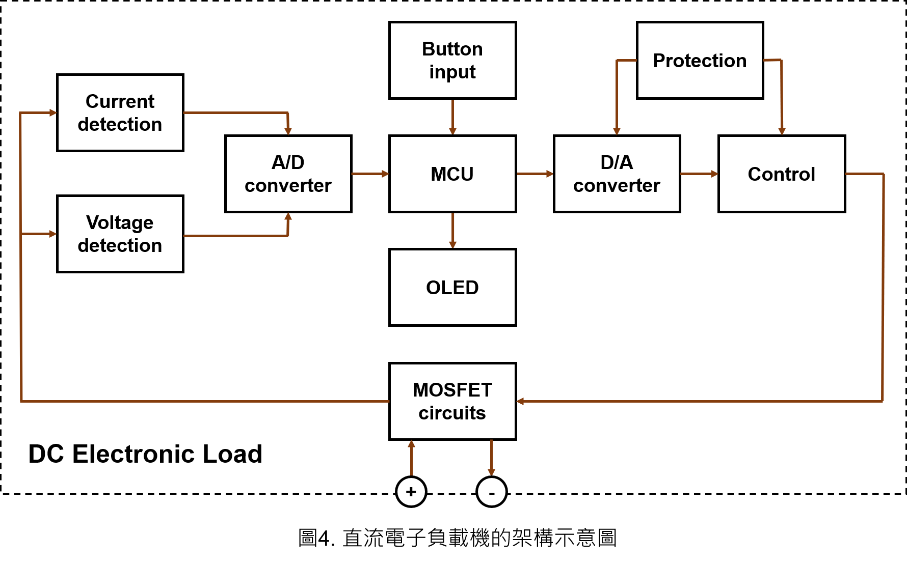 電子負載機是透過功率元件(如 MOSFET)控制導通程度,使其以熱形式耗散所吸收之電能,其電路基本架構圖如圖4。