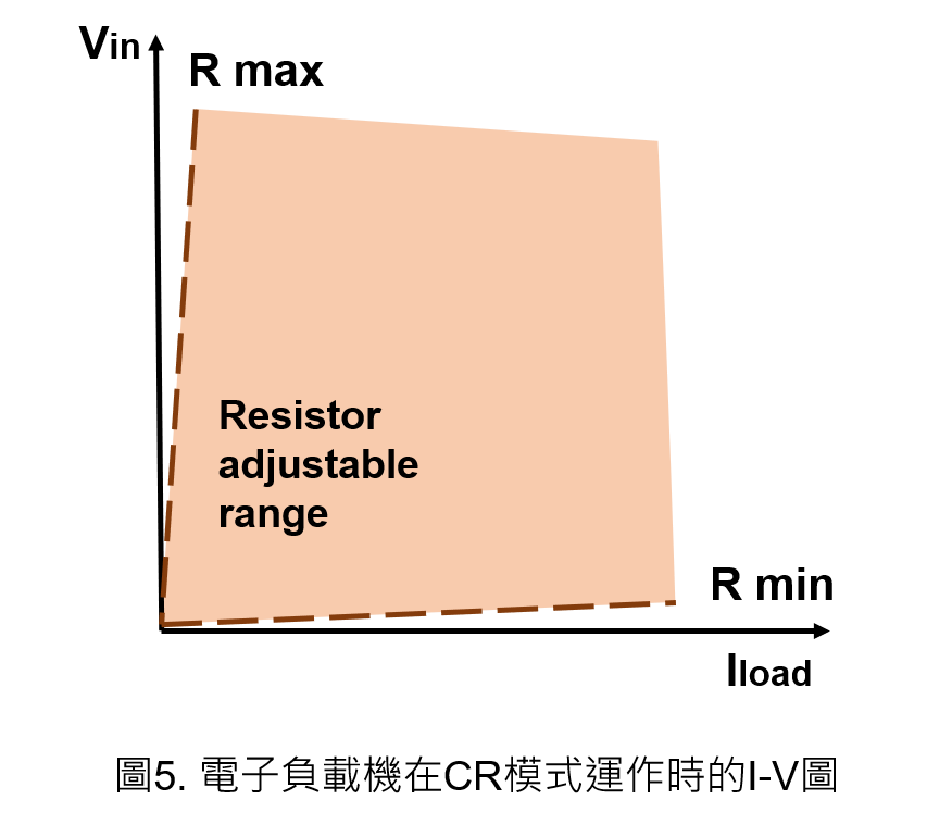 圖5顯示了電子負載機在CR模式下的工作特性,電源負載電壓及電流會隨著電阻斜率線呈線性變化,而電阻值可以在功率輪廓內調整到最小值 (R min) 或最大值 (R Max)。一旦電壓或電流高於最大功率範圍,電子負載機會自動調整輸入設定,使其保持在新選擇範圍內的最接近值。