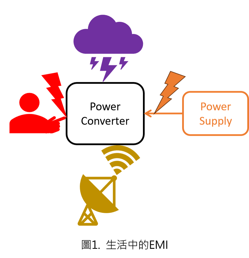 由於電源轉換器在實際應用環境中可能面臨各式各樣的電磁干擾,其來源多樣,如圖1所示,包括因雷擊引起的大電流、人體接觸所產生的靜電放電、無線通訊系統發射的輻射雜訊,以及電源切換或供電連接過程中產生的傳導雜訊與快速暫態干擾。因此,進行電磁耐受度(EMS)測試顯得格外重要,其主要目的是提升轉換器對外部電磁干擾的抵抗能力,確保設備在各種工作條件下皆能穩定且可靠地運行。