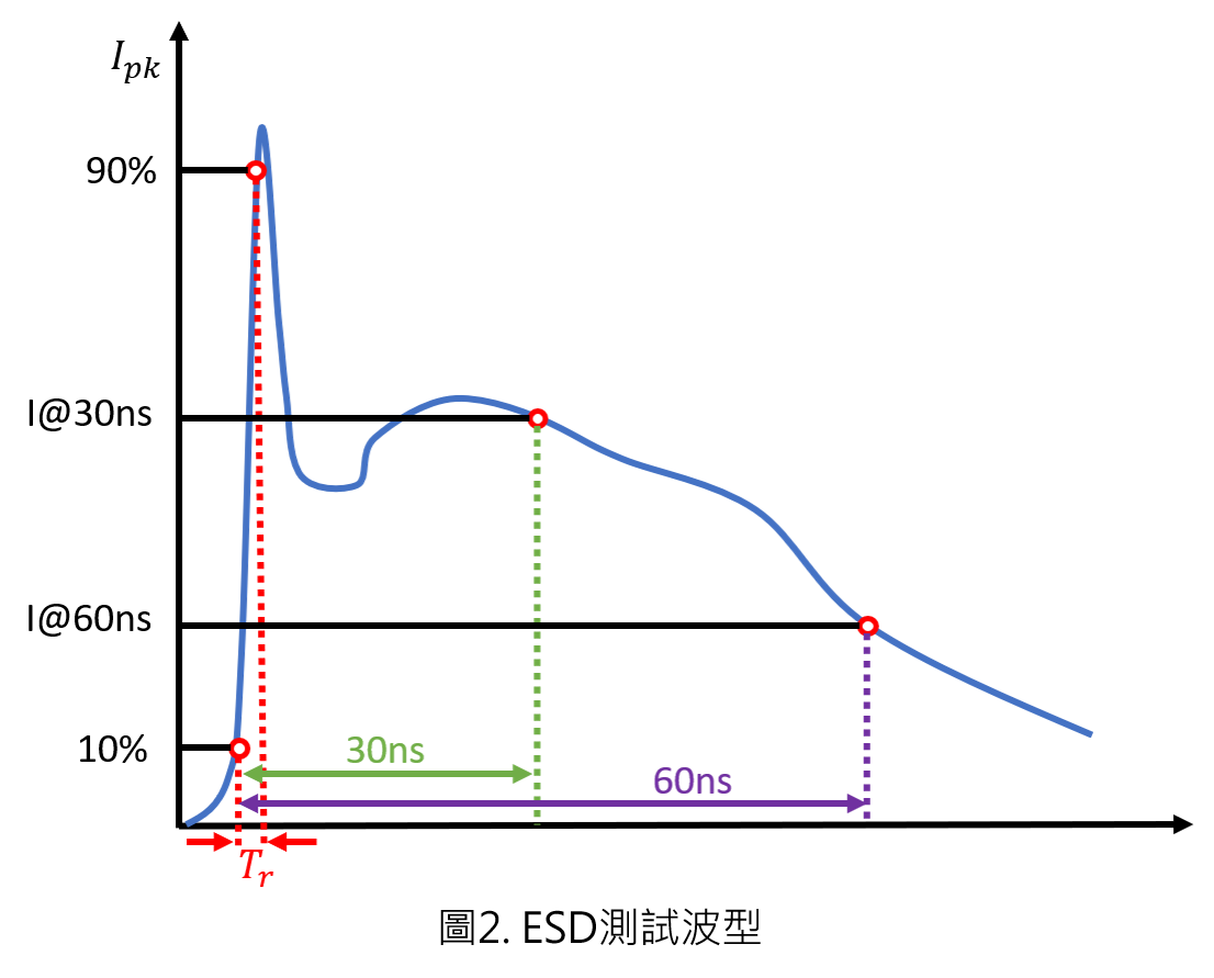 ESD對應標準為 IEC 61000-4-2,詳細規範了ESD的測試方法、波形參數與試驗等級。電流波形特性(圖2):
