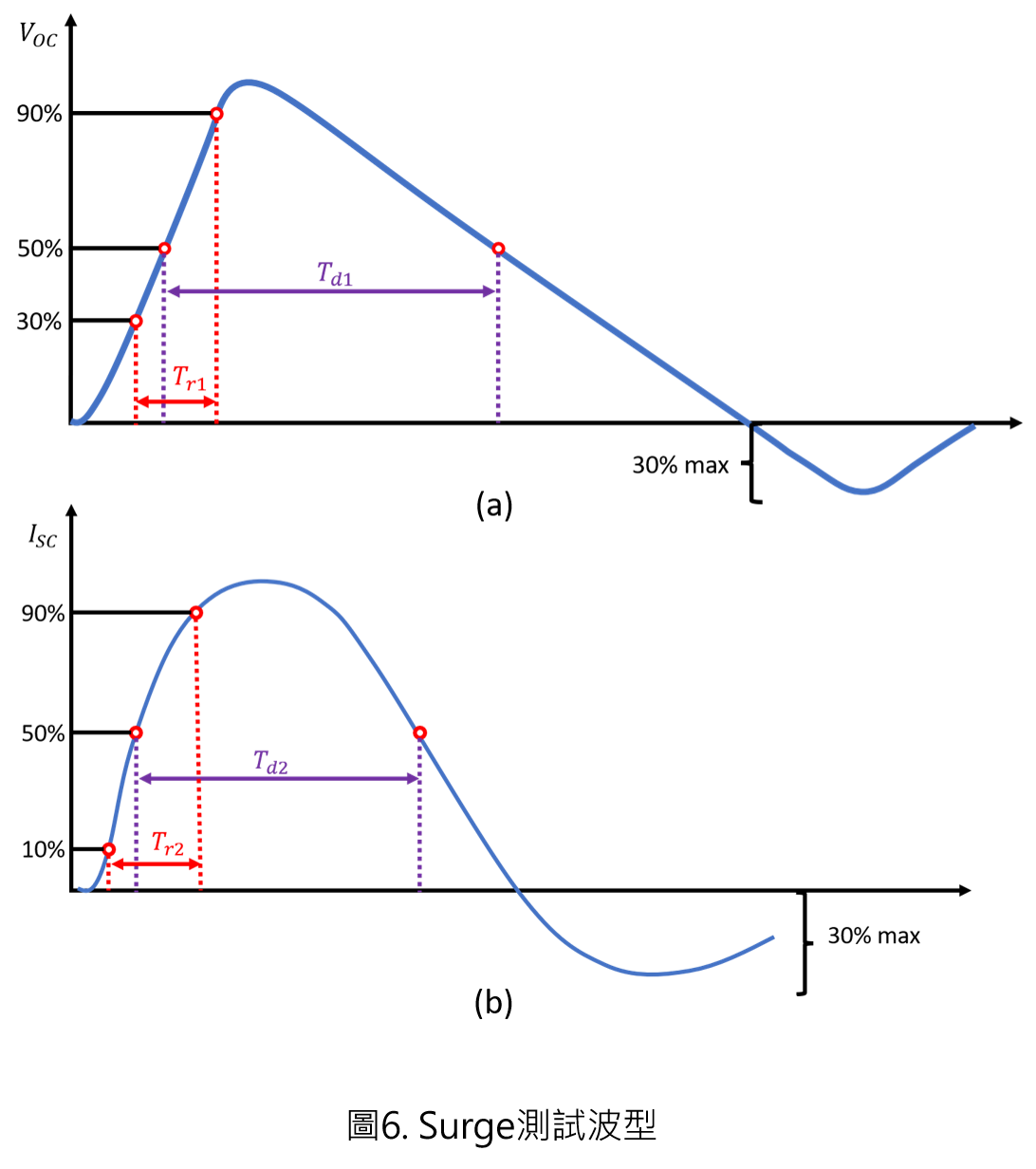 國際標準為 IEC 61000-4-5,規範了Surge的測試波形、測試等級與測試方法。Surge的測試波形可分為兩類:
