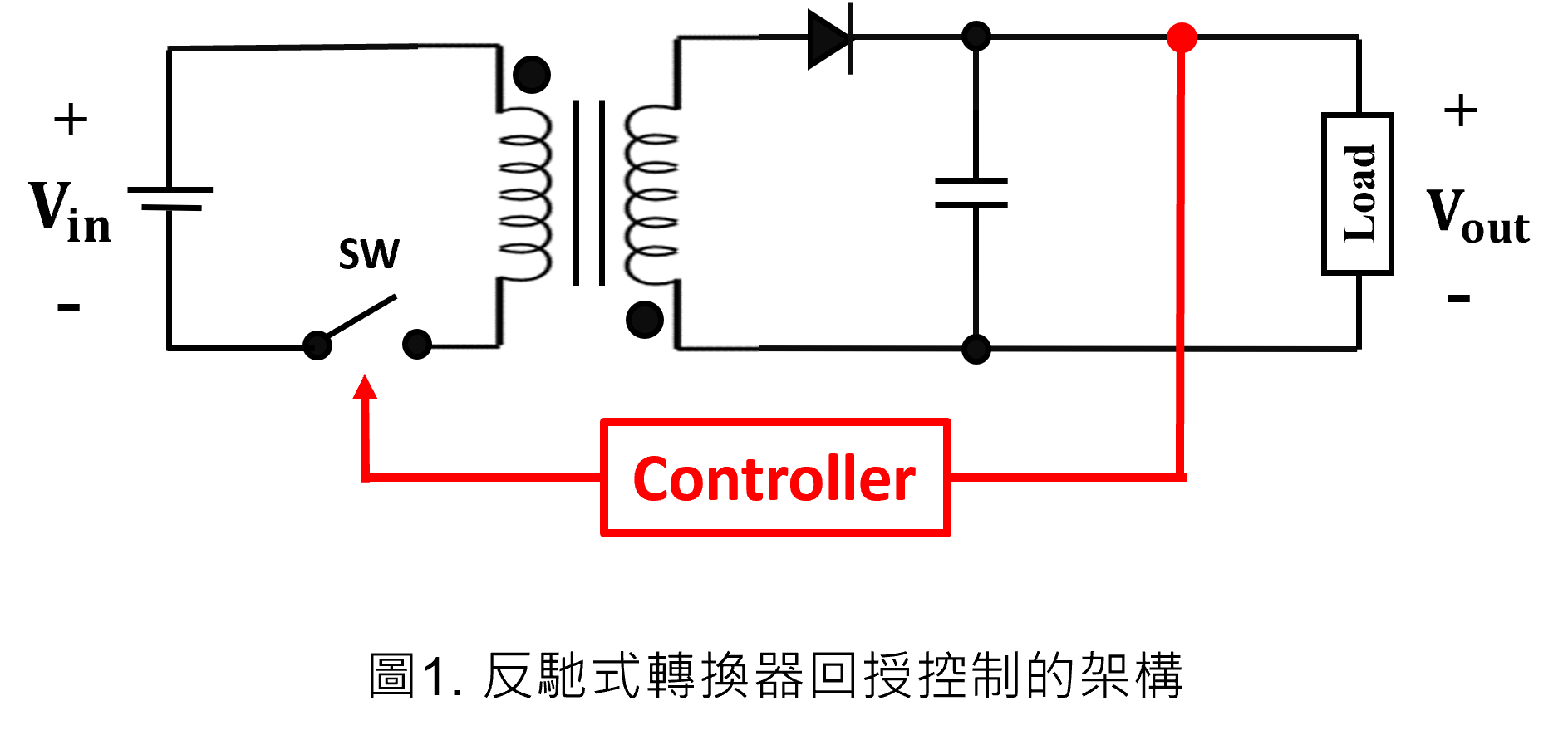 以下為理想的返馳式轉換器的轉移函數,輸出電壓與輸入電壓跟責任週期關係如式(3):