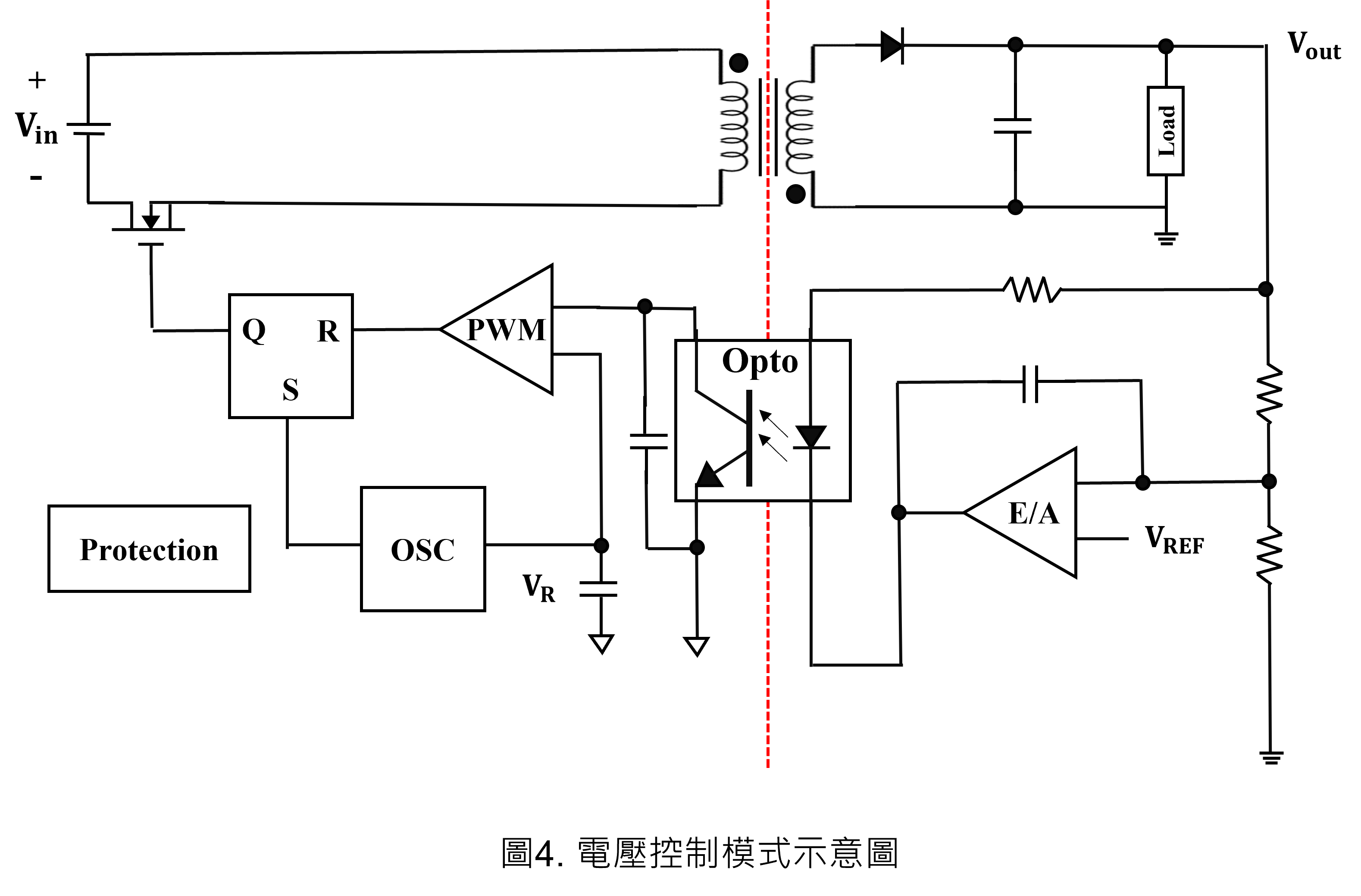 電壓控制模式(Voltage Mode Control, VMC)的運作機制係透過回授網路對輸出電壓進行取樣,並將其與誤差放大器(Error Amplifier, E/A)之基準電壓比較,以產生誤差信號。該誤差信號再與振盪器(Oscillator, OSC)所產生之固定頻率鋸齒波(Sawtooth Ramp)於PWM比較器中進行比較,最終決定開關元件之占空比(Duty Cycle),以調節輸出電壓,如圖4所示。