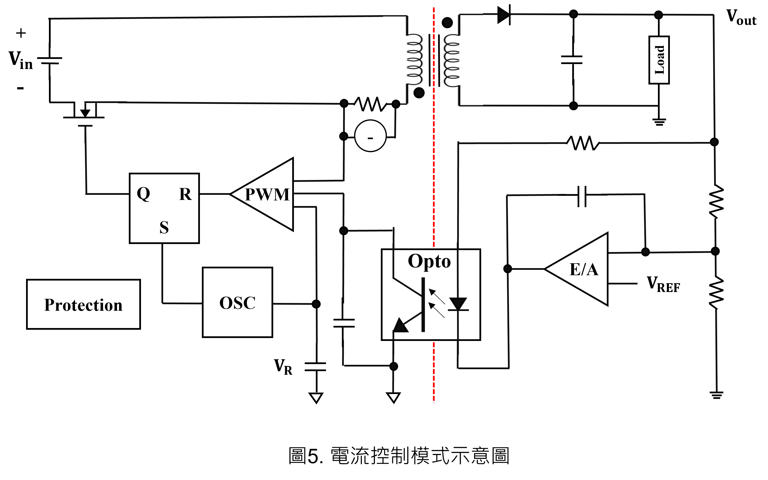 電流控制模式的系統包含電壓回授路徑和電感電流回授路徑。電流回授路徑是感測變壓器的一次側輸入電流,電壓回授路徑是偵測輸出電壓誤差訊號,再經由補償器後,計算兩者訊號的差異,最後,產生PWM控制脈衝訊號,如圖5。